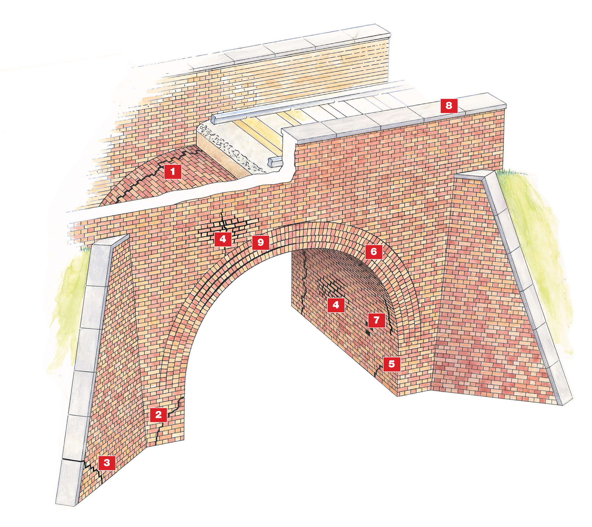 Strukturelle Schäden bei gemauerten Bogenbrücken können durch die gleichzeitige Anwendung verschiedener Helifix-Produkte sicher behoben werden. Kostspielig und verkehrstechnisch aufwändige Maßnahmen wie Abriss und Wiederaufbau lassen sich durch konstruktive Festigung und Stabilisierung der vorhandenen Bausubstanz vermeiden.